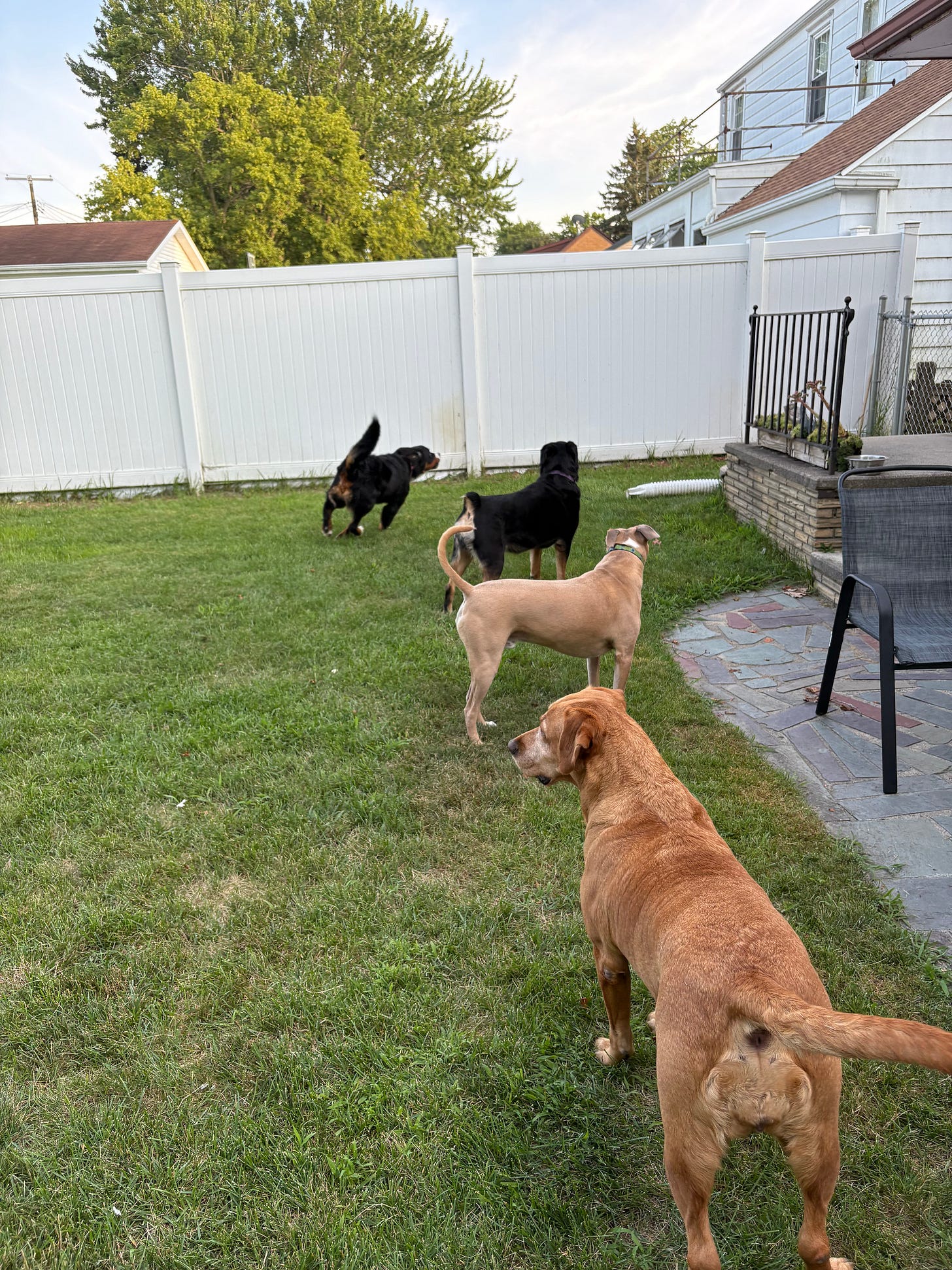 At one point a neighbor dog on the other side of the white fence woofed a loud “hello!”—or maybe it was a “who the heck are you??”—and all our beloved four-legged furbabies went into “Avengers assemble!” mode.