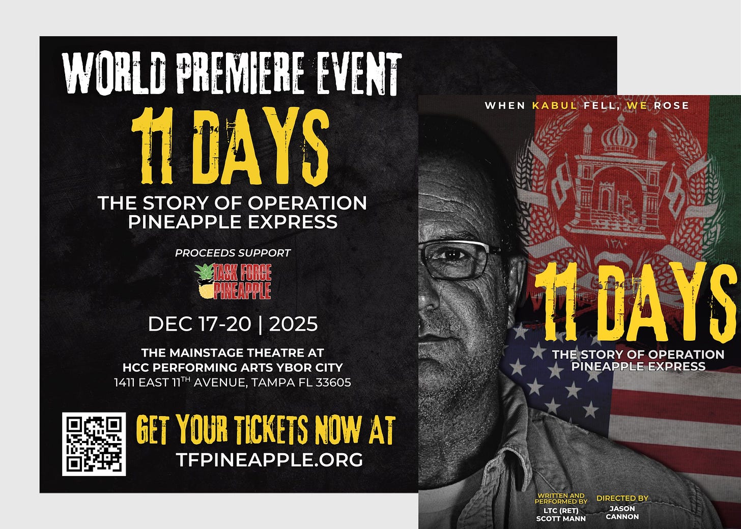 This performance is more than a story—it’s a mission in motion. Proceeds from 11 DAYS benefit Task Force Pineapple, a nonprofit committed to honoring our nation’s defenders and allies through advocacy, healing programs, and life-saving interventions. Your ticket doesn’t just reserve your seat—it helps keep a promise, supports veterans and their families, and continues the fight for those left behind.